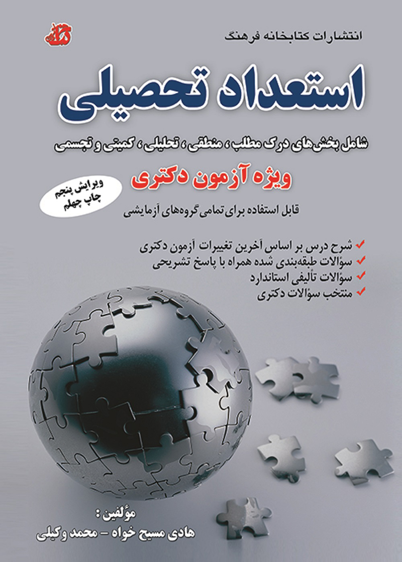 | عنوان کتاب | کتاب استعداد تحصیلی ویژه آزمون دکتری شامل بخش های درک مطلب ، منطقی ، تحلیلی ، کمیتی و تجسمی |